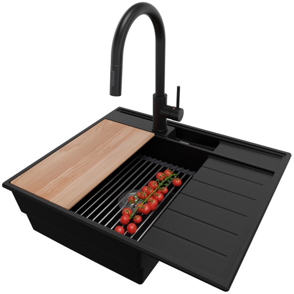 PRIMAGRAN Granitspüle Schwarz 62x53cm, Spülbecken 1 Becken + Küchenarmatur 40x20cm + Ablauf-Set + Küchenzubehörset, Küchenspüle ab 45er Unterschrank - Sydney Pocket
