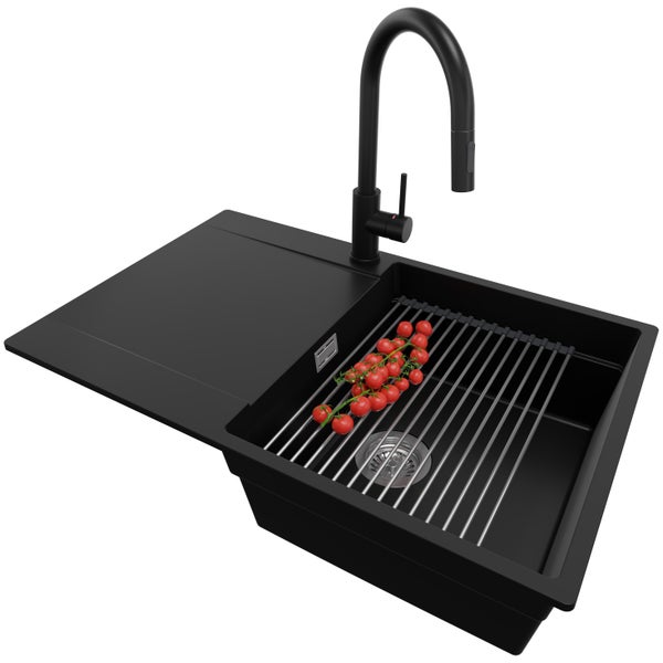 PRIMAGRAN Granitspüle Schwarz 78x50cm, Spülbecken 1 Becken + Küchenarmatur 40x20cm + Ablauf-Set + Aufrollbare Abtropffläche, Küchenspüle ab 50er Unterschrank - San Francisco
