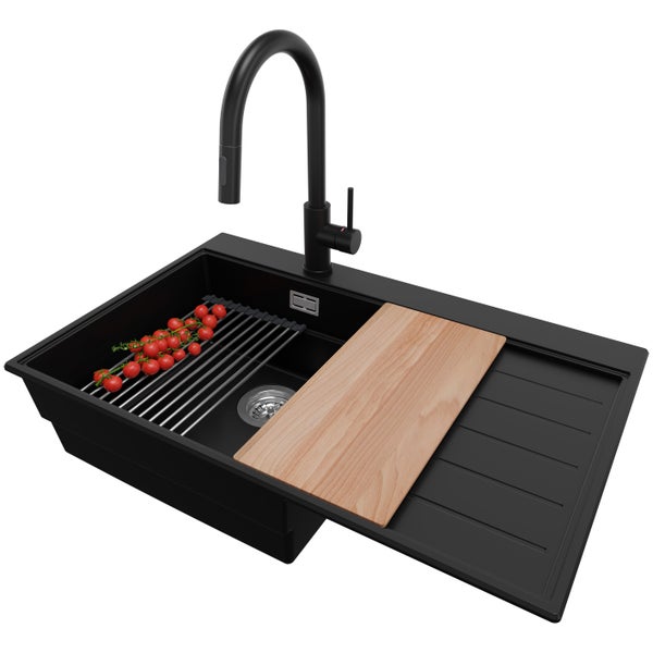 PRIMAGRAN Granitspüle Schwarz 78x50cm, Spülbecken 1 Becken + Küchenarmatur 40x20cm + Ablauf-Set + Küchenzubehörset, Küchenspüle ab 50er Unterschrank - Sydney