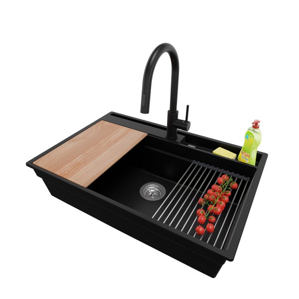 PRIMAGRAN Granitspüle Schwarz 78x53cm, Spülbecken 1 Becken + Küchenarmatur 40x20cm + Ablauf-Set + Küchenzubehörset, Küchenspüle ab 80er Unterschrank - Oslo Pocket