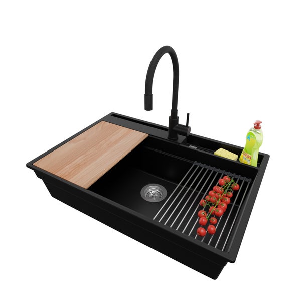 PRIMAGRAN Granitspüle Schwarz 78x53cm, Spülbecken 1 Becken + Küchenarmatur 40x38cm + Ablauf-Set + Küchenzubehörset, Küchenspüle ab 80er Unterschrank - Oslo Pocket