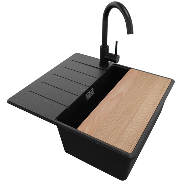 PRIMAGRAN Granitspüle Schwarz Metallic 55x50cm, Spülbecken 1 Becken + Küchenarmatur 32x20cm + Ablauf-Set + Schneidebrett, Küchenspüle ab 40er Unterschrank - Kopenhagen