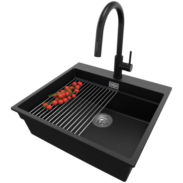 PRIMAGRAN Granitspüle Schwarz Metallic 58x53cm, Spülbecken 1 Becken + Küchenarmatur 40x20cm + Ablauf-Set + Aufrollbare Abtropffläche, Küchenspüle ab 60er Unterschrank - Oslo Max