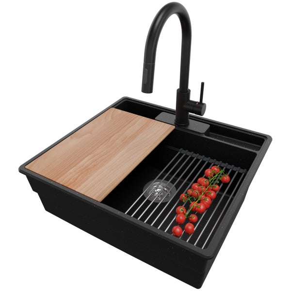 PRIMAGRAN Granitspüle Schwarz Metallic 58x53cm, Spülbecken 1 Becken + Küchenarmatur 40x20cm + Ablauf-Set + Küchenzubehörset, Küchenspüle ab 60er Unterschrank - New York