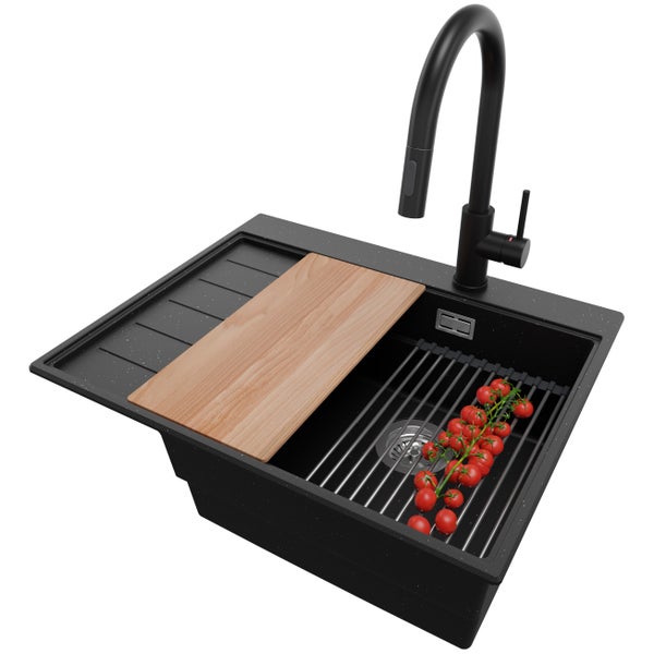 PRIMAGRAN Granitspüle Schwarz Metallic 62x50cm, Spülbecken 1 Becken + Küchenarmatur 40x20cm + Ablauf-Set + Küchenzubehörset, Küchenspüle ab 45er Unterschrank - Sydney