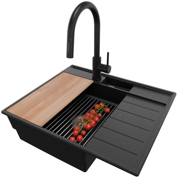 PRIMAGRAN Granitspüle Schwarz Metallic 62x53cm, Spülbecken 1 Becken + Küchenarmatur 40x20cm + Ablauf-Set + Küchenzubehörset, Küchenspüle ab 45er Unterschrank - Sydney Pocket