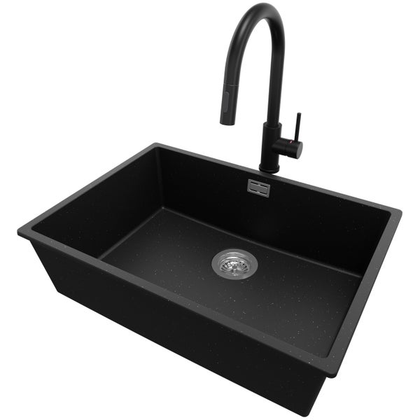 PRIMAGRAN Granitspüle Schwarz Metallic 66x47cm, Spülbecken 1 Becken + Küchenarmatur 40x20cm + Ablauf-Set, Küchenspüle ab 70er Unterschrank - London Slim