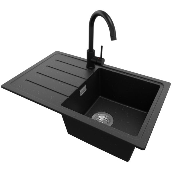 PRIMAGRAN Granitspüle Schwarz Metallic 70x44cm, Spülbecken 1 Becken + Küchenarmatur 32x20cm + Ablauf-Set, Küchenspüle ab 45er Unterschrank - Kopenhagen Easy