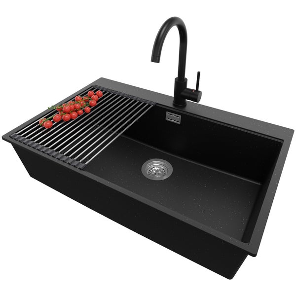 PRIMAGRAN Granitspüle Schwarz Metallic 78x50cm, Spülbecken 1 Becken + Küchenarmatur 32x20cm + Ablauf-Set + Aufrollbare Abtropffläche, Küchenspüle ab 80er Unterschrank - Oslo