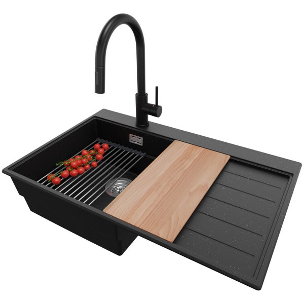 PRIMAGRAN Granitspüle Schwarz Metallic 78x50cm, Spülbecken 1 Becken + Küchenarmatur 40x20cm + Ablauf-Set + Küchenzubehörset, Küchenspüle ab 45er Unterschrank - Sydney