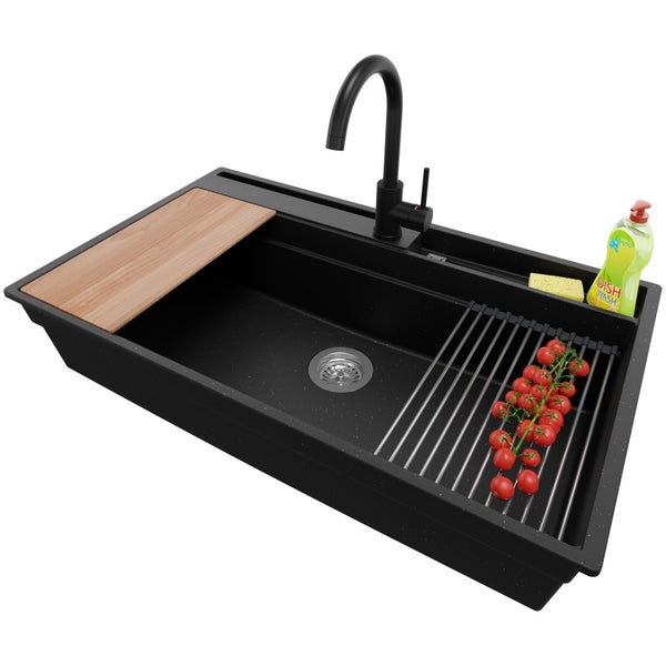 PRIMAGRAN Granitspüle Schwarz Metallic 88x53cm, Spülbecken 1 Becken + Küchenarmatur 32x20cm + Ablauf-Set + Küchenzubehörset, Küchenspüle ab 90er Unterschrank - Oslo Pocket