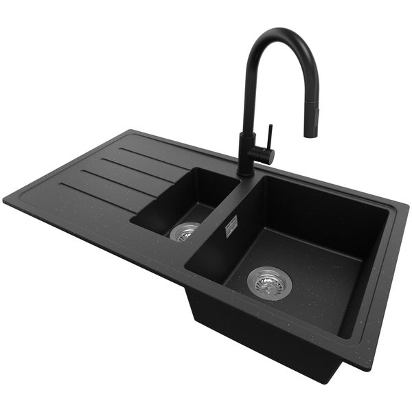 PRIMAGRAN Granitspüle Schwarz Metallic 90x50cm, Spülbecken 1,5 Becken + Küchenarmatur 40x20cm + Ablauf-Set, Küchenspüle ab 60er Unterschrank - Kopenhagen Duo