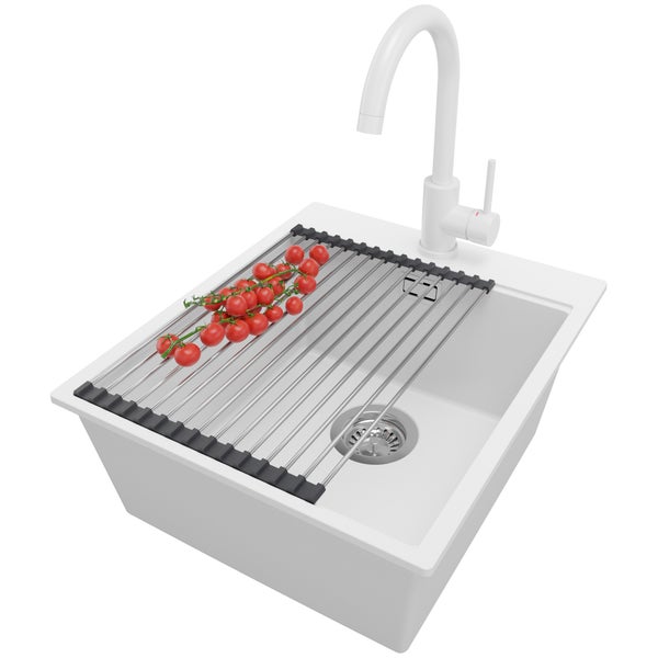 PRIMAGRAN Granitspüle Weiß 43x50cm, Spülbecken 1 Becken + Küchenarmatur 32x20cm + Ablauf-Set + Aufrollbare Abtropffläche, Küchenspüle ab 45er Unterschrank - Oslo