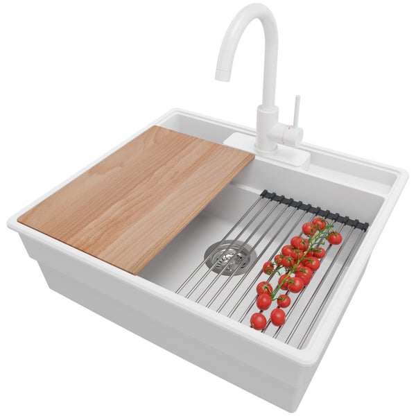 PRIMAGRAN Granitspüle Weiß 58x53cm, Spülbecken 1 Becken + Küchenarmatur 32x20cm + Ablauf-Set + Küchenzubehörset, Küchenspüle ab 60er Unterschrank - New York