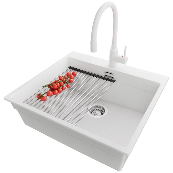 PRIMAGRAN Granitspüle Weiß 58x53cm, Spülbecken 1 Becken + Küchenarmatur 38x14cm + Ablauf-Set + Aufrollbare Abtropffläche, Küchenspüle ab 60er Unterschrank - Oslo Max