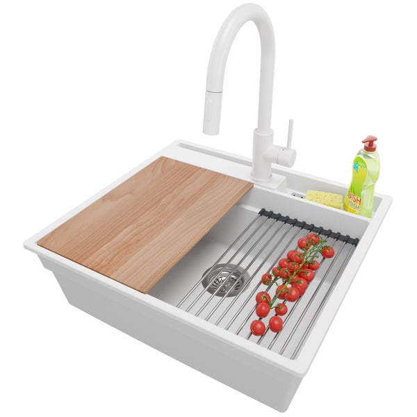 PRIMAGRAN Granitspüle Weiß 58x53cm, Spülbecken 1 Becken + Küchenarmatur 40x20cm + Ablauf-Set + Küchenzubehörset, Küchenspüle ab 60er Unterschrank - Oslo Pocket