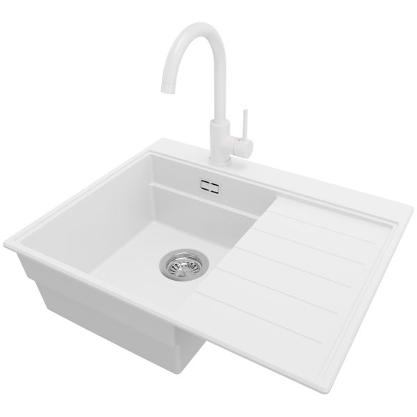 PRIMAGRAN Granitspüle Weiß 62x50cm, Spülbecken 1 Becken + Küchenarmatur 32x20cm + Ablauf-Set, Küchenspüle ab 40er Unterschrank - Sydney