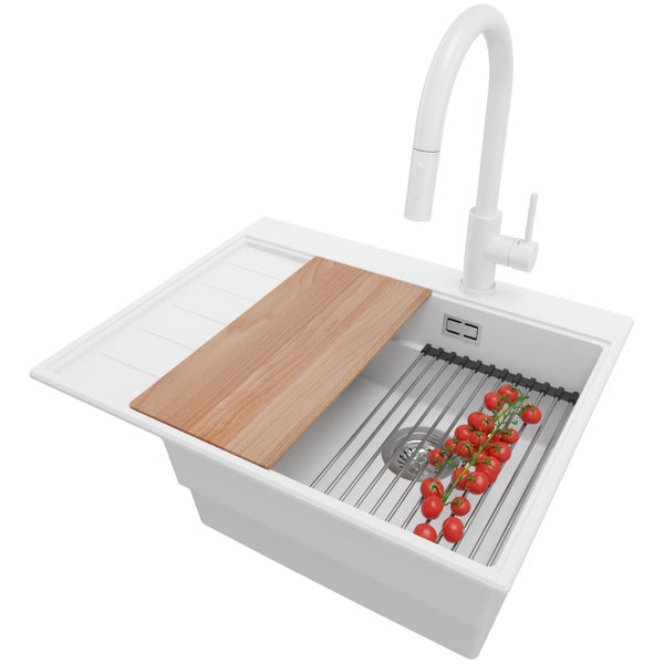 PRIMAGRAN Granitspüle Weiß 62x50cm, Spülbecken 1 Becken + Küchenarmatur 40x20cm + Ablauf-Set + Küchenzubehörset, Küchenspüle ab 45er Unterschrank - Sydney