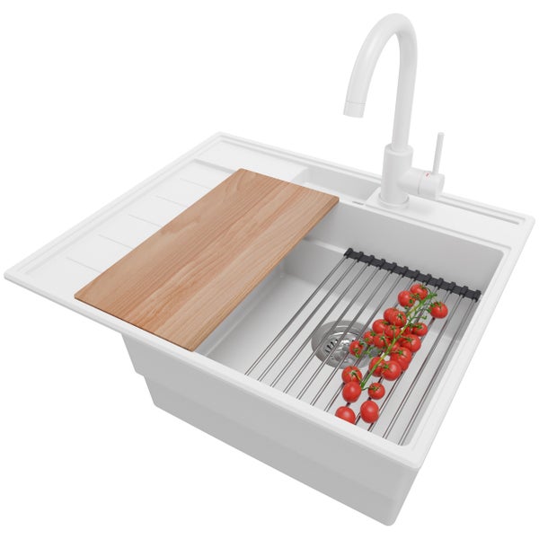 PRIMAGRAN Granitspüle Weiß 62x53cm, Spülbecken 1 Becken + Küchenarmatur 32x20cm + Ablauf-Set + Küchenzubehörset, Küchenspüle ab 45er Unterschrank - Sydney Pocket