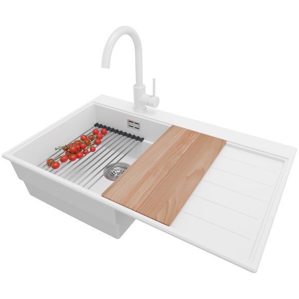 PRIMAGRAN Granitspüle Weiß 78x50cm, Spülbecken 1 Becken + Küchenarmatur 32x20cm + Ablauf-Set + Küchenzubehörset, Küchenspüle ab 45er Unterschrank - Sydney
