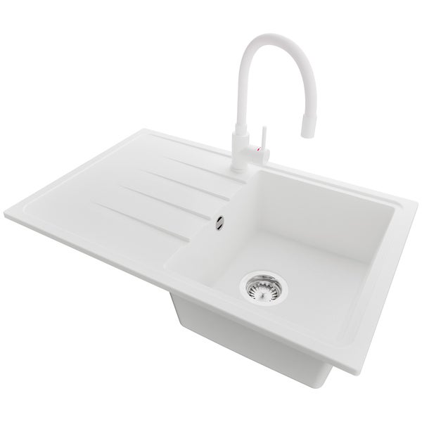 PRIMAGRAN Granitspüle Weiß 78x50cm, Spülbecken 1 Becken + Küchenarmatur 38x14cm + Ablauf-Set, Küchenspüle ab 45er Unterschrank - Mailand