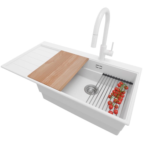 PRIMAGRAN Granitspüle Weiß 90x50cm, Spülbecken 1 Becken + Küchenarmatur 40x20cm + Ablauf-Set + Küchenzubehörset, Küchenspüle ab 60er Unterschrank - Sydney