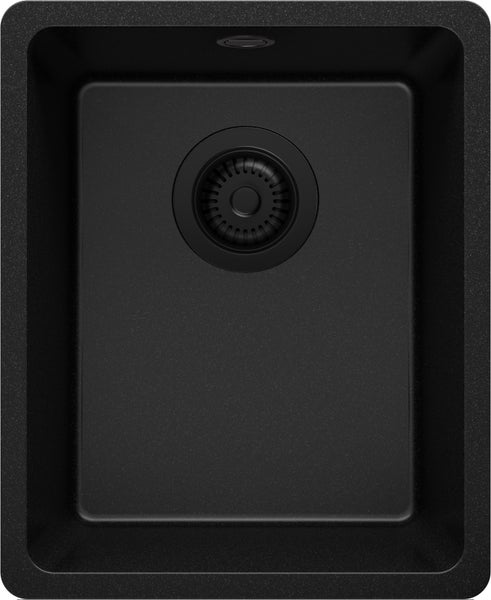PRIMAGRAN Spülbecken Alles Schwarz 36x44cm, Granitspüle 1 Becken + Ablauf-Set, Küchenspüle ab 40er Unterschrank - Venedig Slim Easy