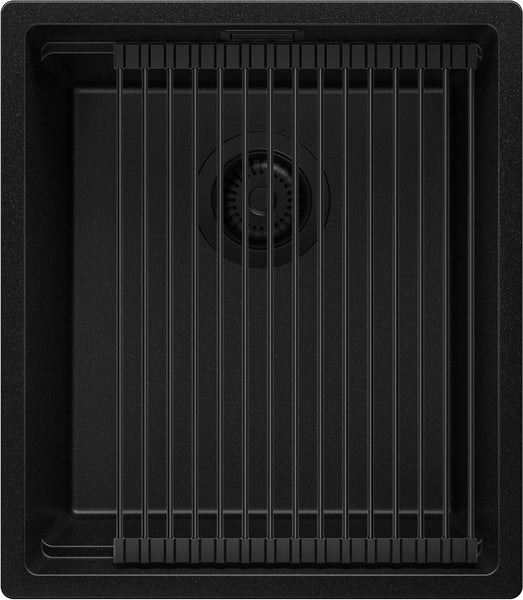 PRIMAGRAN Spülbecken Alles Schwarz 41x47cm, Granitspüle 1 Becken + Ablauf-Set + Aufrollbare Abtropffläche, Küchenspüle ab 45er Unterschrank - Praga Slim