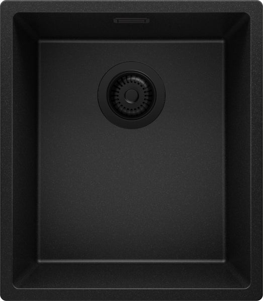 PRIMAGRAN Spülbecken Alles Schwarz 41x47cm, Granitspüle 1 Becken + Ablauf-Set, Küchenspüle ab 45er Unterschrank - London Slim
