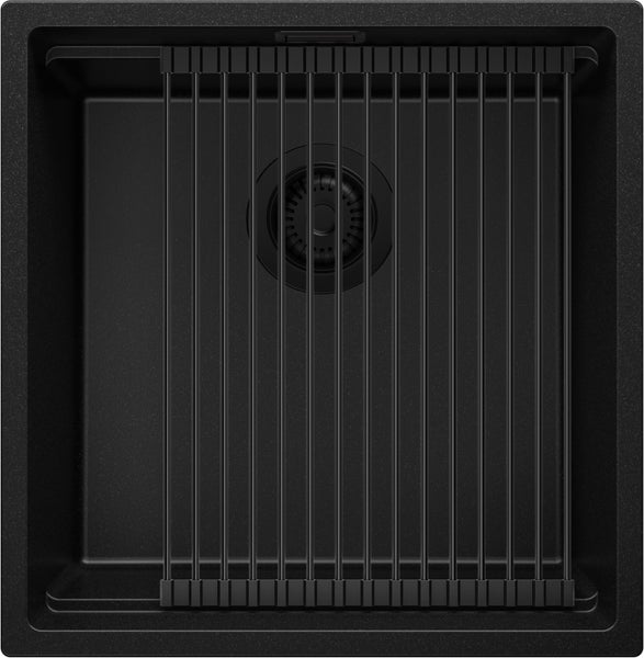 PRIMAGRAN Spülbecken Alles Schwarz 46x47cm, Granitspüle 1 Becken + Ablauf-Set + Aufrollbare Abtropffläche, Küchenspüle ab 50er Unterschrank - Praga Slim