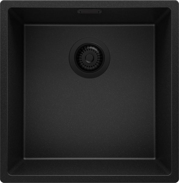 PRIMAGRAN Spülbecken Alles Schwarz 46x47cm, Granitspüle 1 Becken + Ablauf-Set, Küchenspüle ab 50er Unterschrank - London Slim