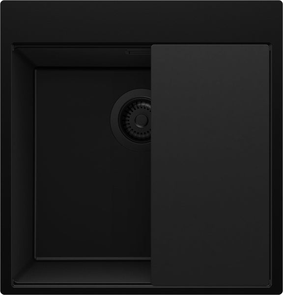 PRIMAGRAN Spülbecken Alles Schwarz 48x50cm, Granitspüle 1 Becken + Ablauf-Set + Schneidebrett, Küchenspüle ab 50er Unterschrank - Oslo