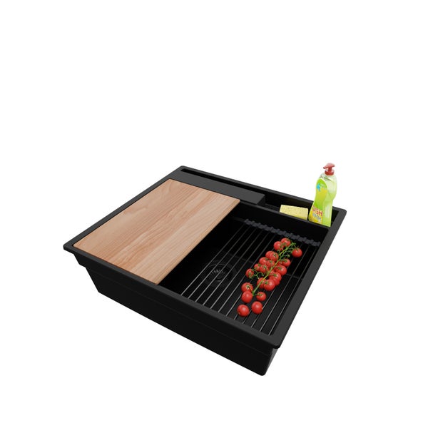 PRIMAGRAN Spülbecken Alles Schwarz 58x53cm, Granitspüle 1 Becken + Ablauf-Set + Küchenzubehörset, Küchenspüle ab 60er Unterschrank - Oslo Pocket