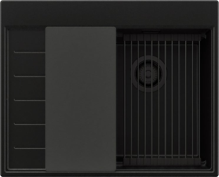PRIMAGRAN Spülbecken Alles Schwarz 62x50cm, Granitspüle 1 Becken + Ablauf-Set + Küchenzubehörset, Küchenspüle ab 40er Unterschrank - Sydney