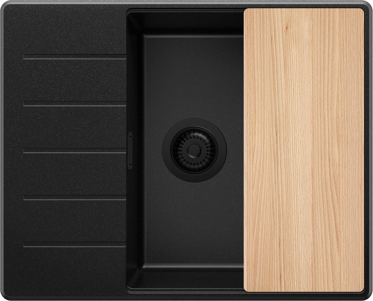 PRIMAGRAN Spülbecken Alles Schwarz 62x50cm, Granitspüle 1 Becken + Ablauf-Set + Schneidebrett, Küchenspüle ab 50er Unterschrank - Kopenhagen