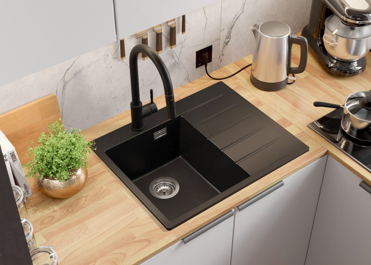 PRIMAGRAN Spülbecken Alles Schwarz 62x53cm, Granitspüle 1 Becken + Ablauf-Set + Küchenzubehörset, Küchenspüle ab 45er Unterschrank - Sydney Pocket