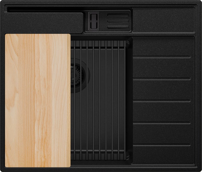 PRIMAGRAN Spülbecken Alles Schwarz 62x53cm, Granitspüle 1 Becken + Ablauf-Set + Küchenzubehörset, Küchenspüle ab 45er Unterschrank - Sydney Pocket