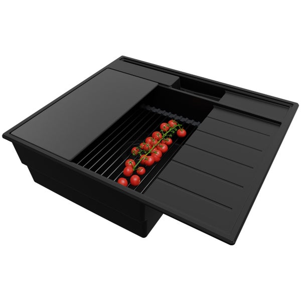 PRIMAGRAN Spülbecken Alles Schwarz 62x53cm, Granitspüle 1 Becken + Ablauf-Set + Küchenzubehörset, Küchenspüle ab 45er Unterschrank - Sydney Pocket