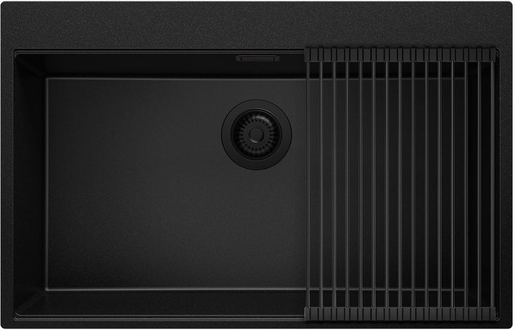 PRIMAGRAN Spülbecken Alles Schwarz 78x50cm, Granitspüle 1 Becken + Ablauf-Set + Aufrollbare Abtropffläche, Küchenspüle ab 80er Unterschrank - Oslo