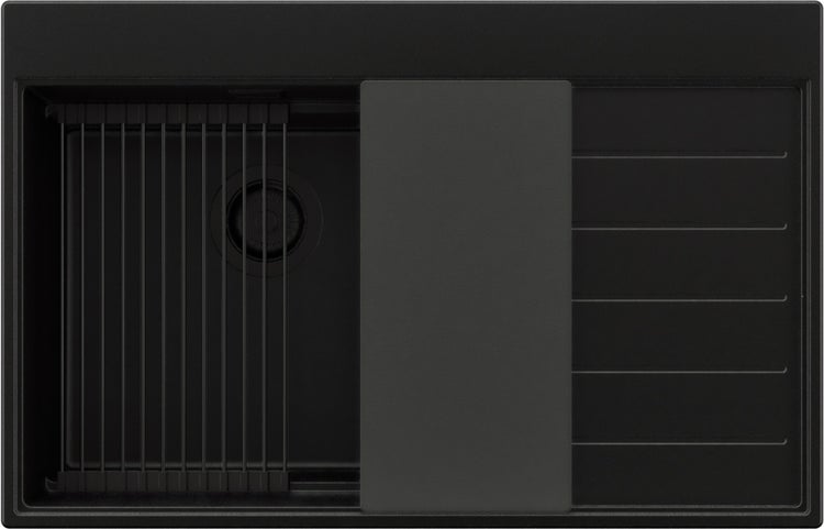 PRIMAGRAN Spülbecken Alles Schwarz 78x50cm, Granitspüle 1 Becken + Ablauf-Set + Küchenzubehörset, Küchenspüle ab 50er Unterschrank - Sydney