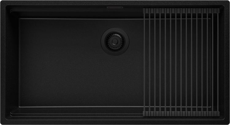 PRIMAGRAN Spülbecken Alles Schwarz 86x47cm, Granitspüle 1 Becken + Ablauf-Set + Aufrollbare Abtropffläche, Küchenspüle ab 90er Unterschrank - Praga Slim