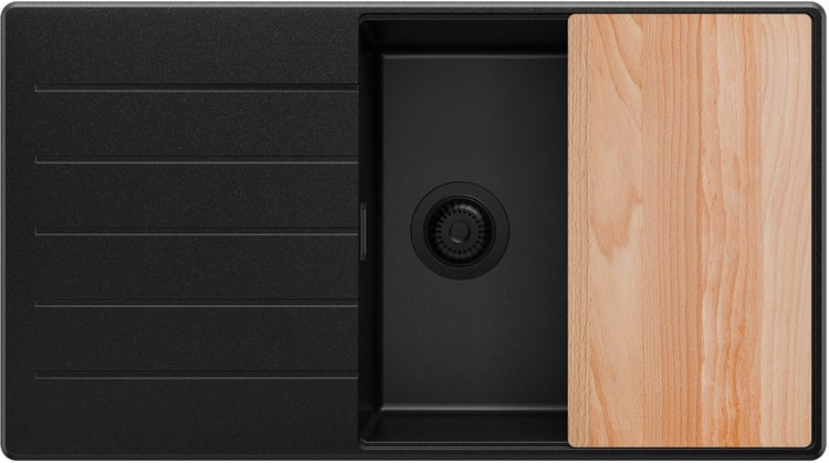 PRIMAGRAN Spülbecken Alles Schwarz 90x50cm, Granitspüle 1 Becken + Ablauf-Set + Schneidebrett, Küchenspüle ab 60er Unterschrank - Kopenhagen