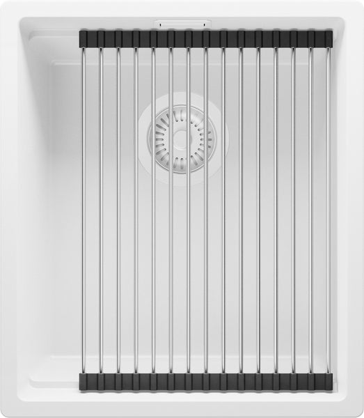 PRIMAGRAN Spülbecken Alles Weiß 41x47cm, Granitspüle 1 Becken + Ablauf-Set + Aufrollbare Abtropffläche, Küchenspüle ab 45er Unterschrank - Praga Slim