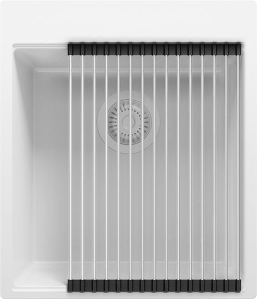 PRIMAGRAN Spülbecken Alles Weiß 43x50cm, Granitspüle 1 Becken + Ablauf-Set + Aufrollbare Abtropffläche, Küchenspüle ab 45er Unterschrank - Oslo