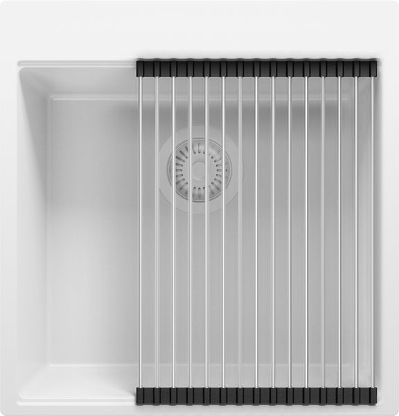 PRIMAGRAN Spülbecken Alles Weiß 48x50cm, Granitspüle 1 Becken + Ablauf-Set + Aufrollbare Abtropffläche, Küchenspüle ab 50er Unterschrank - Oslo