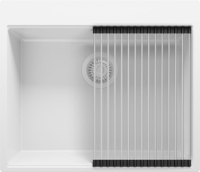 PRIMAGRAN Spülbecken Alles Weiß 58x50cm, Granitspüle 1 Becken + Ablauf-Set + Aufrollbare Abtropffläche, Küchenspüle ab 60er Unterschrank - Oslo