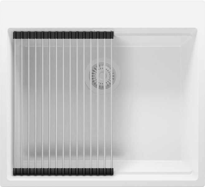 PRIMAGRAN Spülbecken Alles Weiß 58x53cm, Granitspüle 1 Becken + Ablauf-Set + Aufrollbare Abtropffläche, Küchenspüle ab 60er Unterschrank - Oslo Max
