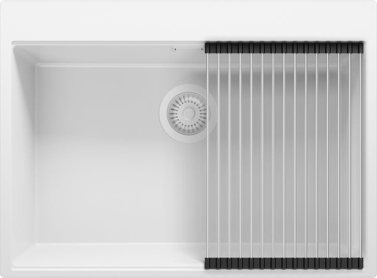PRIMAGRAN Spülbecken Alles Weiß 68x50cm, Granitspüle 1 Becken + Ablauf-Set + Aufrollbare Abtropffläche, Küchenspüle ab 70er Unterschrank - Oslo