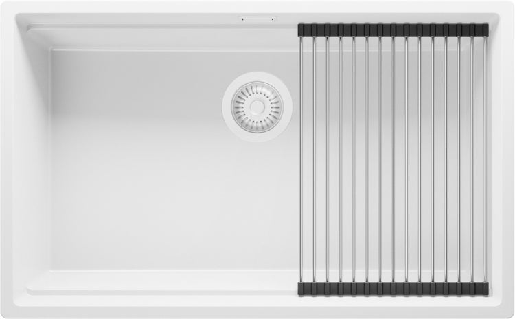 PRIMAGRAN Spülbecken Alles Weiß 76x47cm, Granitspüle 1 Becken + Ablauf-Set + Aufrollbare Abtropffläche, Küchenspüle ab 80er Unterschrank - Praga Slim