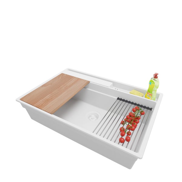 PRIMAGRAN Spülbecken Alles Weiß 78x53cm, Granitspüle 1 Becken + Ablauf-Set + Küchenzubehörset, Küchenspüle ab 80er Unterschrank - Oslo Pocket